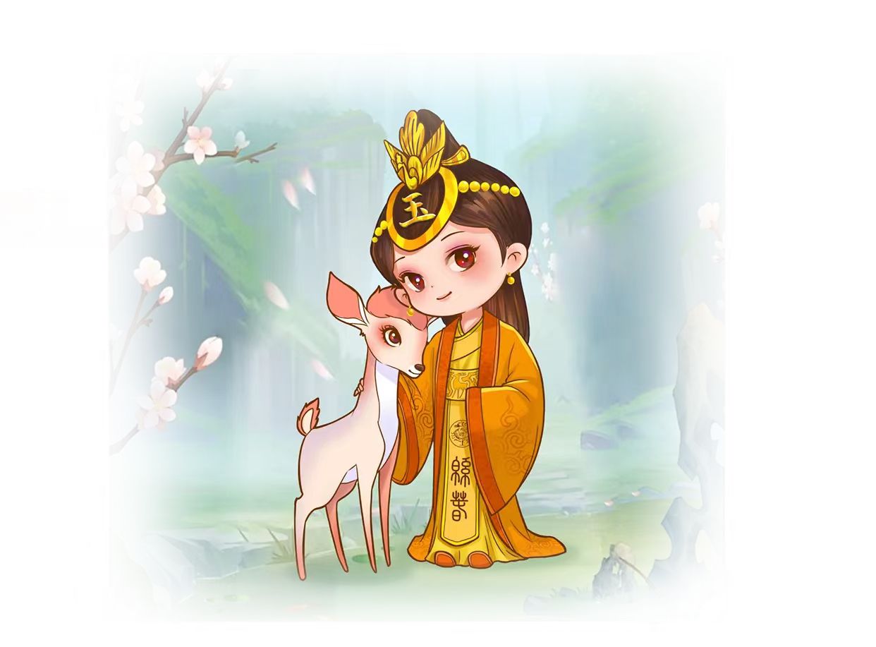 玉妃的衣服及頭飾采用了戰(zhàn)國時期的“鳳凰”紋樣,符合玉妃貴為“蜀王妃”的高貴身份。同時,紋樣上的“綿春”的篆字,和整體相得益彰,且符合時代背景。為了表現(xiàn)出玉妃和“鹿堂山”神鹿的密切關系,吉祥物還設計了母鹿的伴生造型。該設計參考了敦煌壁畫九色鹿的風格,古樸靈動。