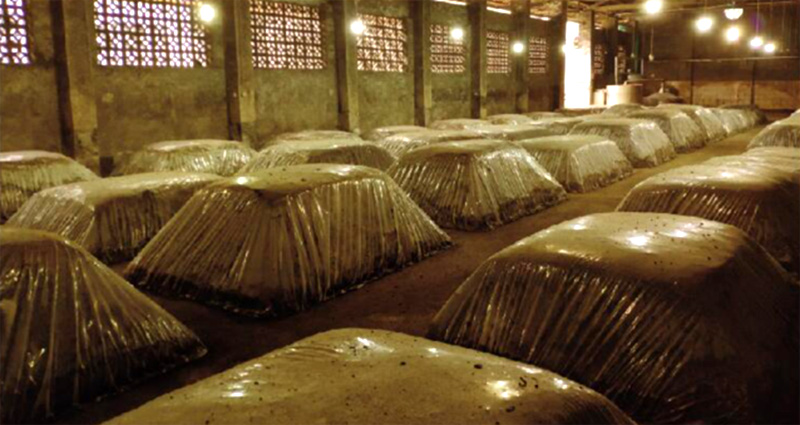 綿春貢酒采用固態(tài)發(fā)酵蒸餾法,把發(fā)酵酒醅加熱生成蒸汽,將易揮發(fā)的酒精、水、雜酯油及酯類物質蒸發(fā)為氣體后再冷卻為液體,將酒醅中4—6%的酒精濃縮到50一70%,由此產(chǎn)生原酒。掐頭去尾裝入酒海,進行脂化老熟。