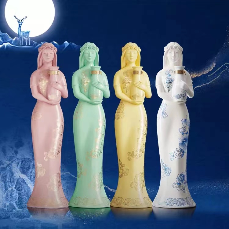 玉妃酒的酒瓶設(shè)計(jì),由于采用了開盲盒的形式,一樣的外盒里,隨機(jī)放置有郎窯綠、粉紅釉、明黃釉、青花瓷4種顏色的瓶子,不但分別對應(yīng)不同的季節(jié)變化,還給“玉妃酒”新的營銷模式。