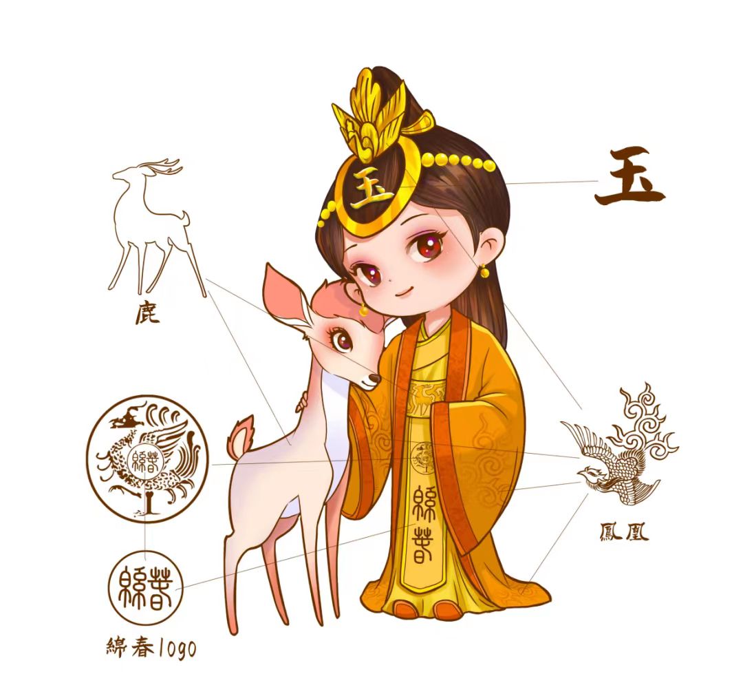 玉妃的衣服及頭飾采用了戰(zhàn)國時期的“鳳凰”紋樣,符合玉妃貴為“蜀王妃”的高貴身份。同時,紋樣上的“綿春”的篆字,和整體相得益彰,且符合時代背景。為了表現(xiàn)出玉妃和“鹿堂山”神鹿的密切關系,吉祥物還設計了母鹿的伴生造型。該設計參考了敦煌壁畫九色鹿的風格,古樸靈動。